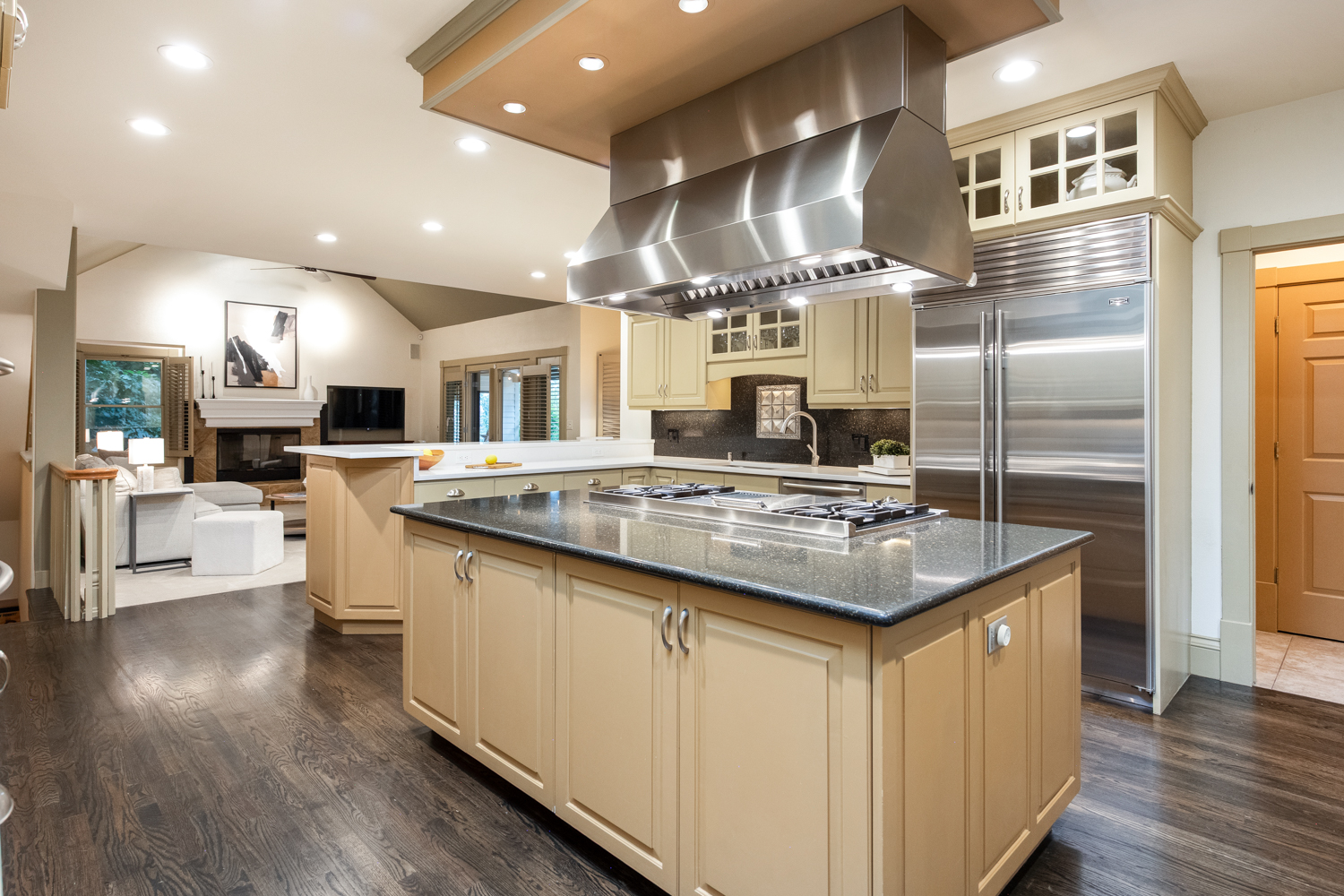 Remodeled kitchen flows naturally into the family room.